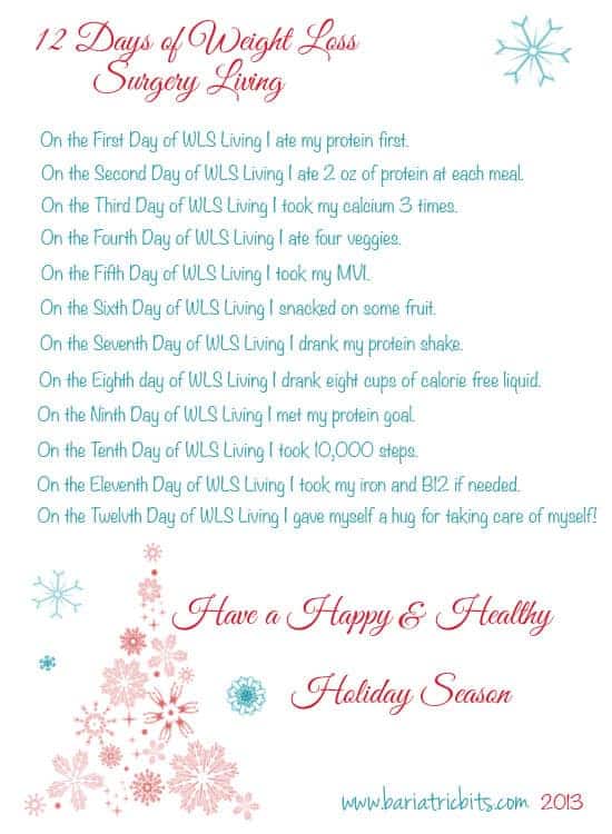 12 Days of Post Weight Loss Surgery Living In honor of the 12 Days of Christmas I came up with the 12 Days of Post Weight Loss Surgery Living. Hope you enjoy! Feel free to share.. « Eat Well While Giving ThanksLow Sugar Crescent Cookies »