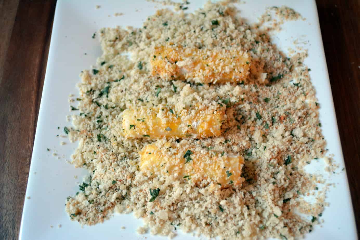 - Dip cheese sticks first into flour, then into egg, and finally into crumb mixture and coat well.