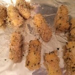 This recipe comes from Skinnytaste.com. I love the recipes on Skinny Taste and highly recommend the site. The mozzarella cheese sticks need to be frozen before you work with them, otherwise the cheese will ooze out before they are fully baked. Once the cheese sticks are frozen they are then coated with egg, flour, and finally crunchy bread crumbs.