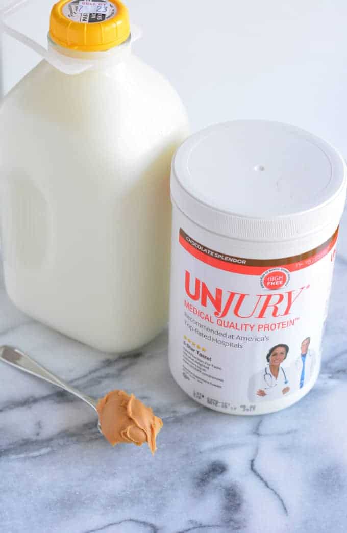 I love chocolate anything. Most of my patients love chocolate too. You don't have to use Unjury. You can use any chocolate protein powder. I do love their chocolate and strawberry. This chocolate peanut butter protein shake is the most common recipe I share. My kids even like this shake and frequently ask me to make it. I do use regular peanut butter, which does increase the calorie content. You could use a peanut butter powder if you wish to lower the calorie content. In my opinion, though the added healthy fats from regular peanut butter increase satiety.