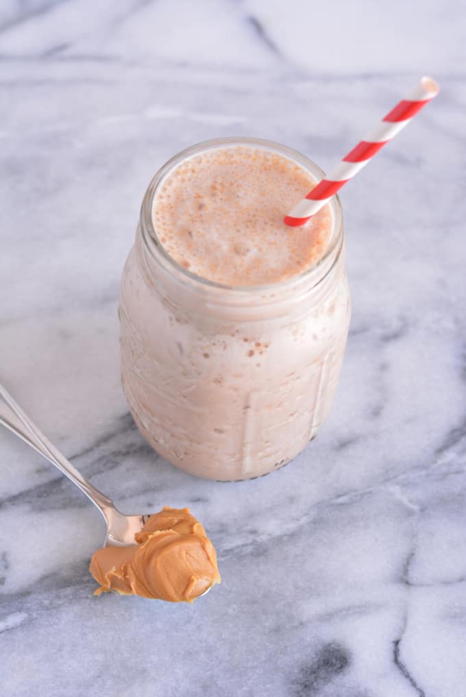 - In a blender place ice, milk, protein powder, and peanut butter.